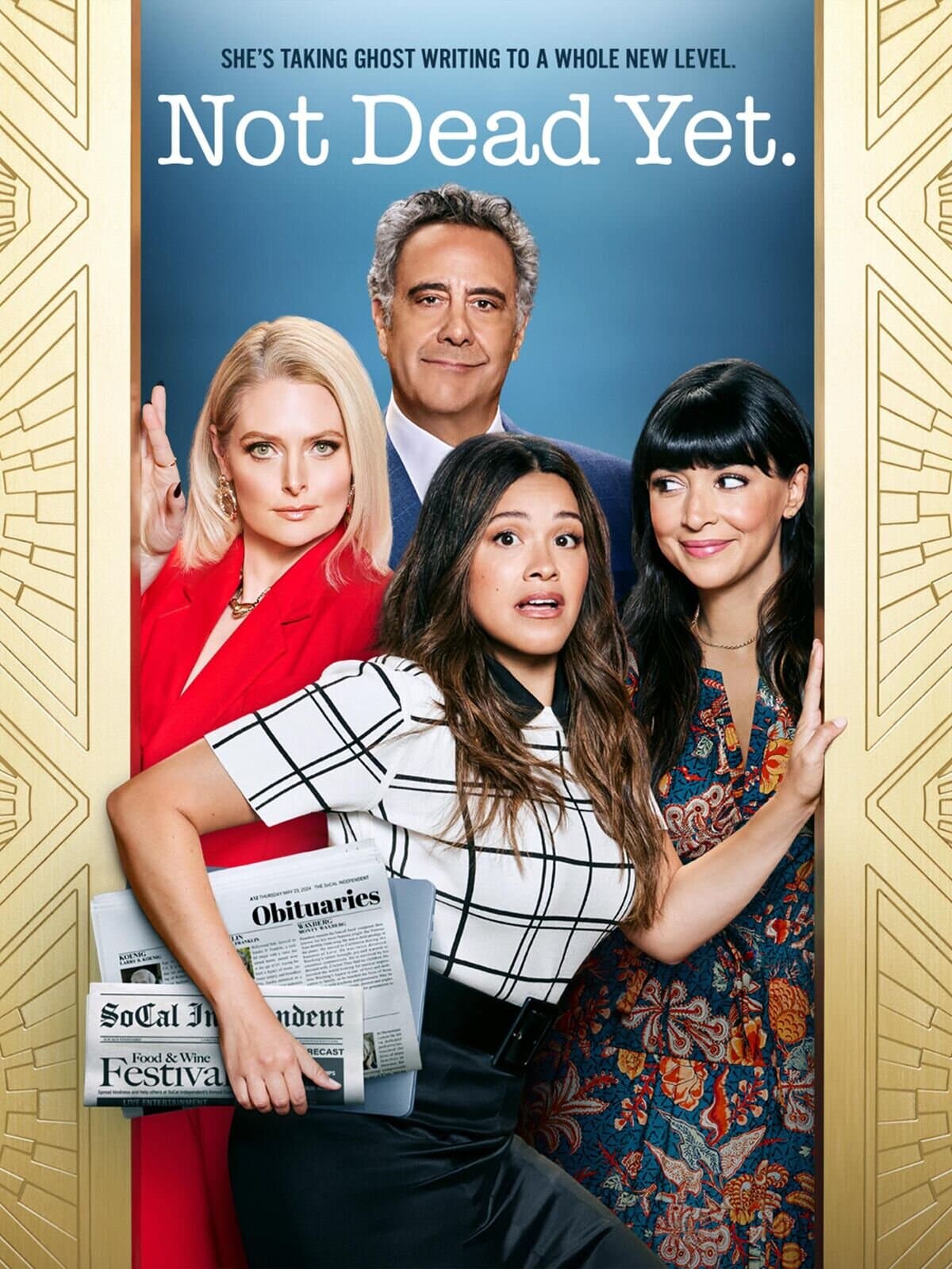 Not Dead Yet follows Nell Serrano, broke, newly single and feeling old, a a self-described 40-something disaster, who works to restart the life and career she left behind 10 years ago. When she lands the only job she can find – writing obituaries – Nell starts getting life advice from an unlikely source.
